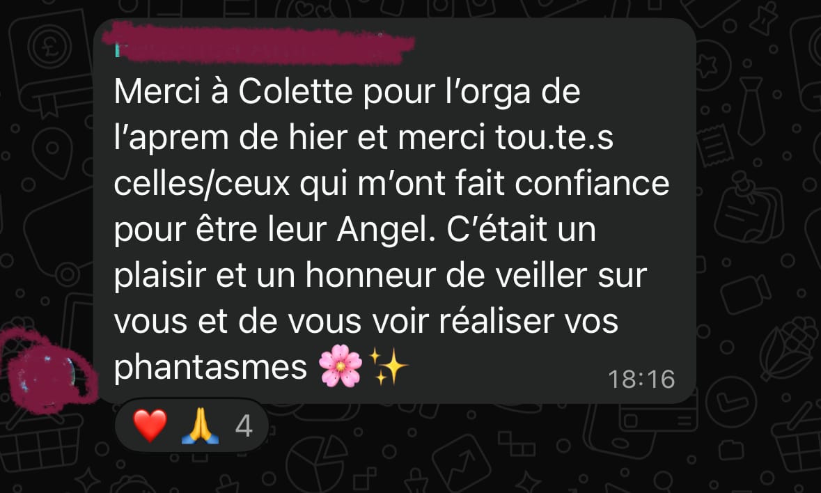 Quand j'ai observé que la majorité des femmes hétéro cis présentes étaient en demande de pluralité, d'avoir plusieurs hommes sur elles. Bien que je comprends le caractère excitant, je me suis questionnée sur la posture juste à avoir en tant qu'organisatrice. Ce format est engageant. Pour les participant·es, mais aussi pour moi. Le débrief avec les participant·es après l'atelier m'a rassuré d'entendre à nouveau que tout s'était passé de la meilleure manière pour elles et eux.